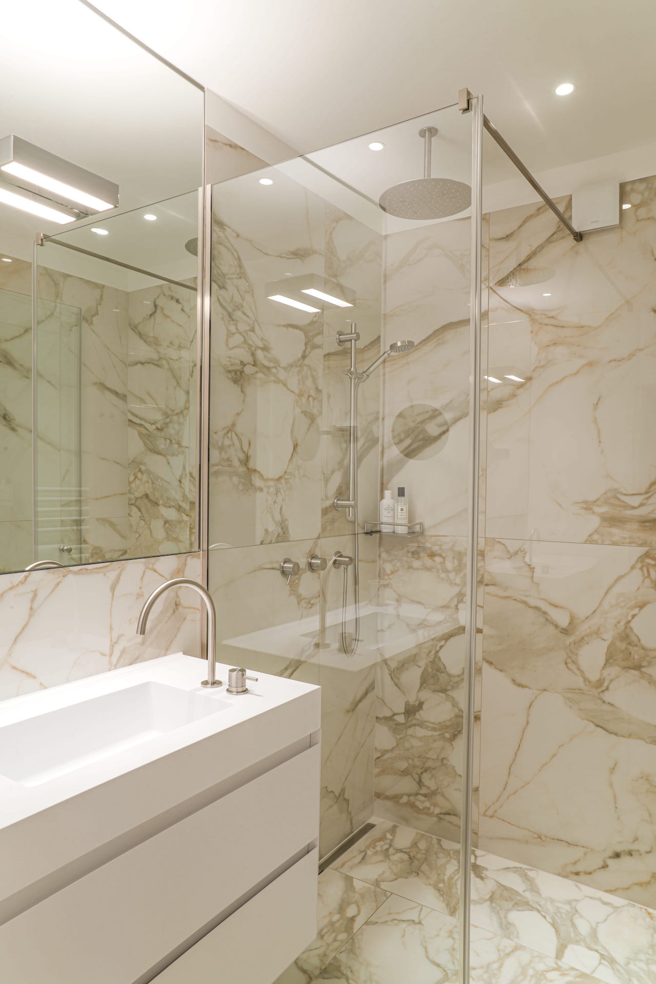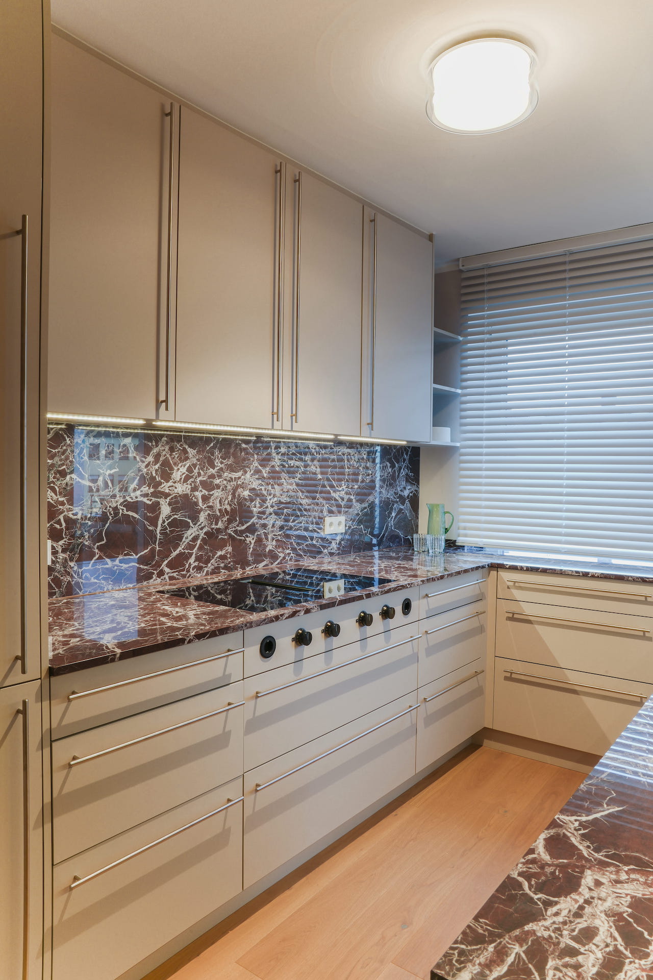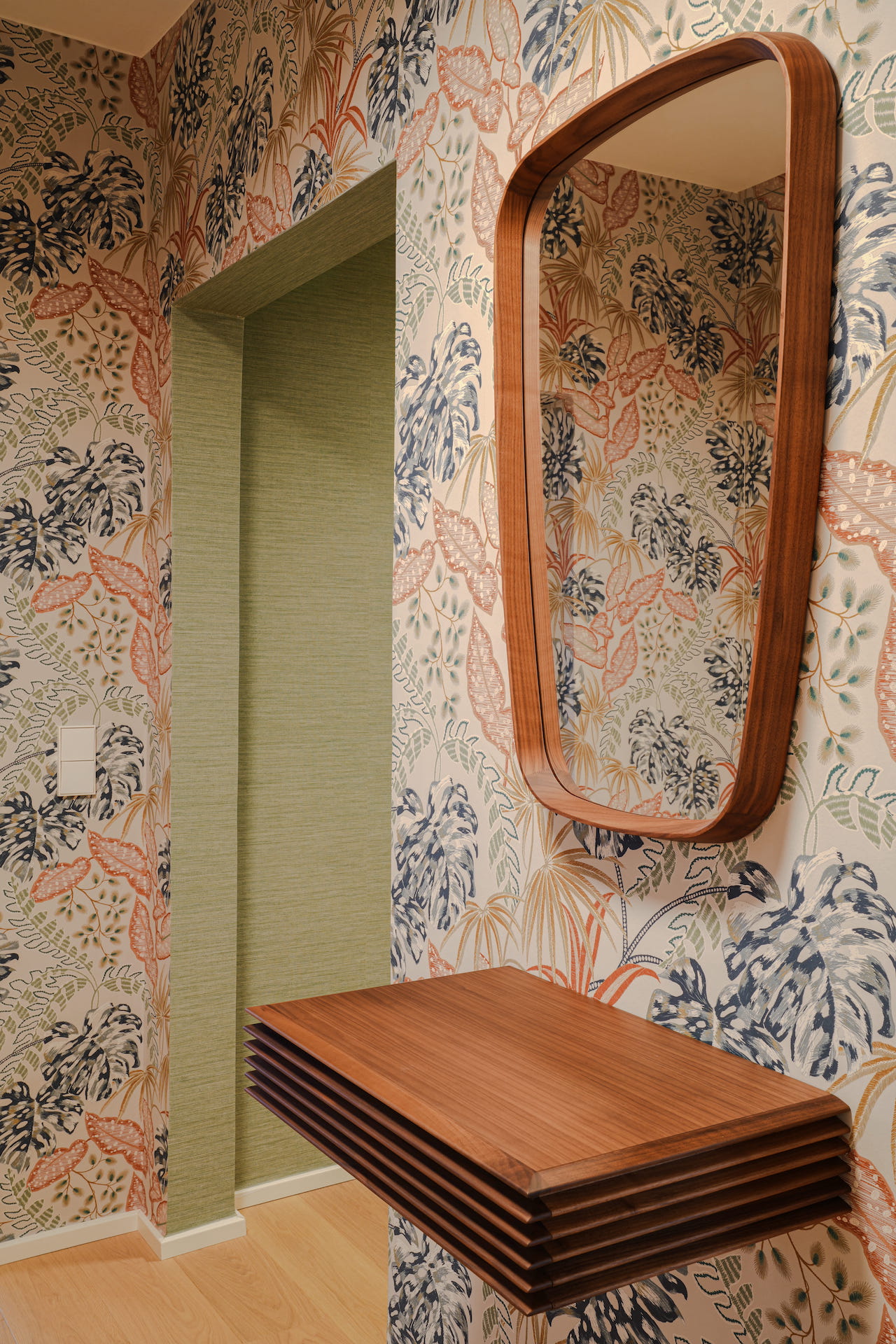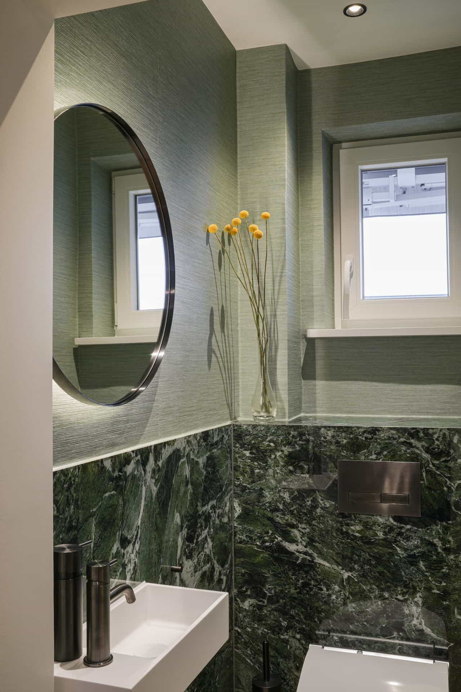 Farben und Materialien der Einbauten sind fein aufeinander abgestimmt und ziehen sich wie ein roter Faden durch die gesamte Wohnung. Die Symbiose aus modernen Möbeln und neu bezogenen Antiquitäten verleiht dem Objekt seinen einzigartigen Charme. Eine Tapete mit Leinenstruktur, ein warmer Eichendielenboden und ein außergewöhnlicher Naturstein sind nur einige der Elemente, die diese Wohnung zu einem echten Juwel machen.