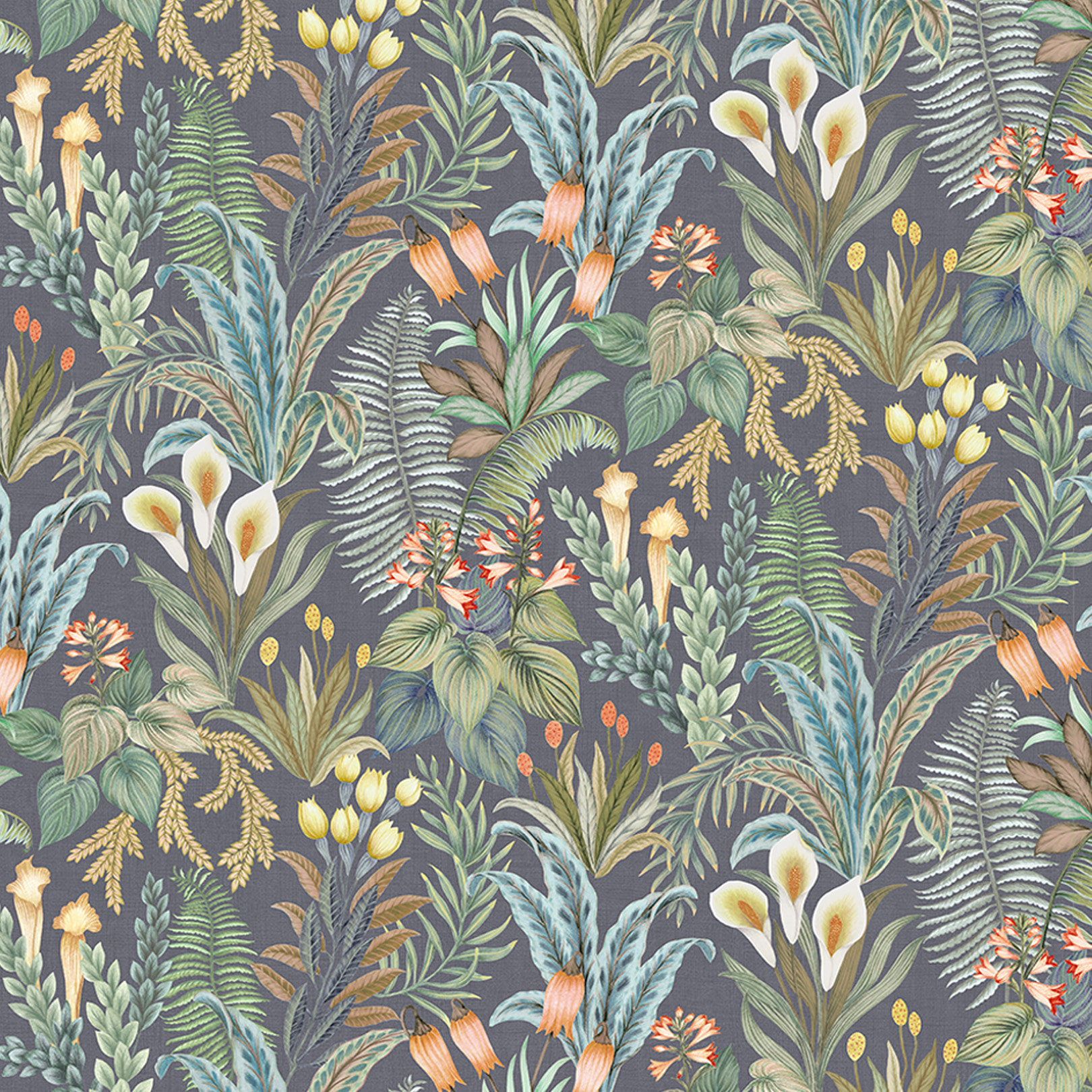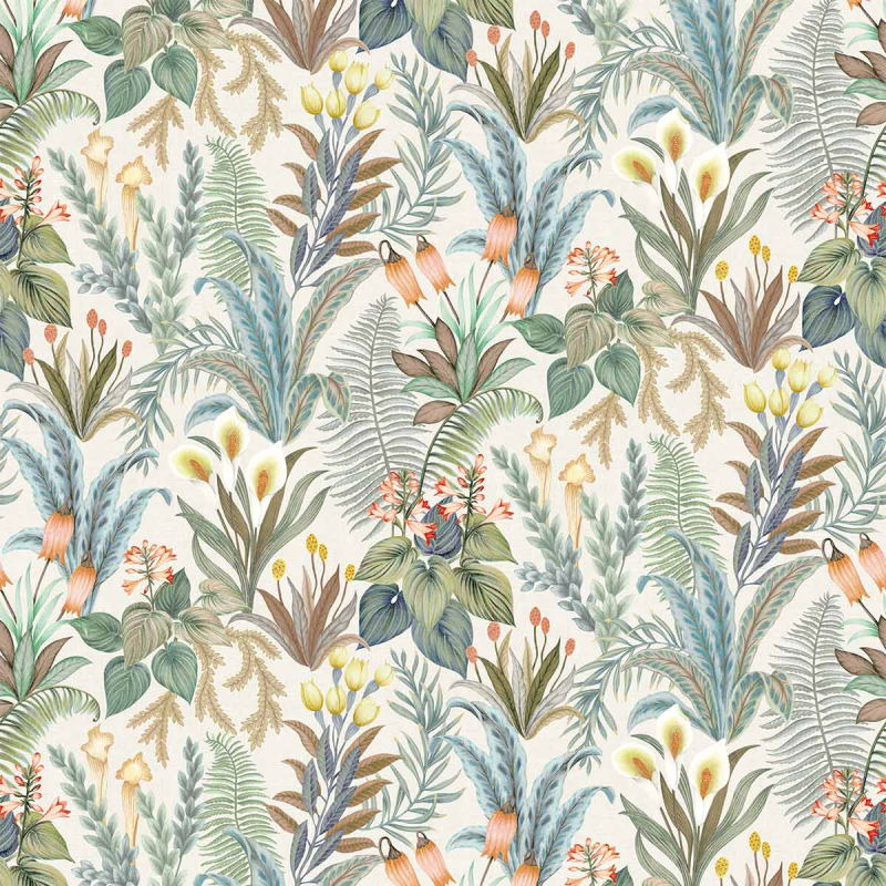 Die Tapete Calla Lily zeigt ein flächendeckendes Muster aus Wasserpflanzen und Lilienblüten, das sich harmonisch über die Fläche ausbreitet. Der strukturierte, leinenartige Untergrund verleiht dem Design zusätzliche Tiefe und sorgt für eine natürliche, hochwertige Wirkung.
